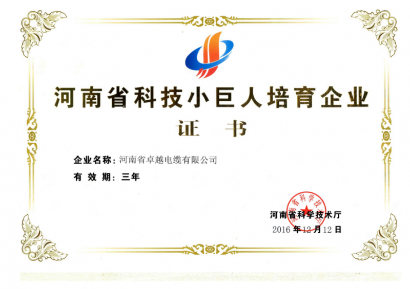 祝賀河南省卓越電纜有限公司成為“河南省科技小巨人培育企業”