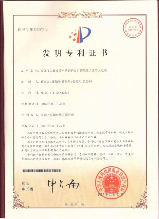 喜訊——“無機防火套型礦物絕緣柔性防火電纜”獲國家發(fā)明**